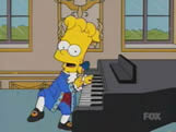 MOZART Wolfgang Mozart (Bart) is a big hit in Vienna, playing a sonata on a grand piano as if he were playing at a rock concert. Antonio Salieri (Lisa) asks her father to be allowed to lead the next time, but Homer will have none of it. At a Music Awards function, Mozart wins the best composer award, making Salieri's envy reach a boiling point. Fops and dandies gather to watch Mozart's next opera, where sitting in the balcony is the Emperor (Montgomery Burns). Salieri gets an idea and serves the Emperor free wine, spiked with a sleeping potion. The opera seems to be going pretty well, but that all changes when the audience hears the Emperor snoozing away. Immediately, everyone starts to dislike the opera. Mozart is shocked that his work is a flop. This leads to Mozart's decline. He develops a high fever and becomes very ill. Soon, Mozart is dying and his family gathers around him. Salieri feels a bit guilty about her hand in all this, saying she only wanted to ruin his life, not kill him. Mozart confesses that he thought highly of Salieri's work, believing that it would be remembered more than his, but with his youthful death, both he and his music will be immortalised forever. He then dies. The next day, Salieri goes to the Emperor's court to play to submit her work, but the court is already being focused on the work of Beethoven (Nelson). Befuddled, Salieri hails a carriage to the mental asylum, gets in and laughs hysterically as the carriage draws away.