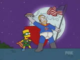 When the Rich Texan judges Lisa's place setting entry to be last, Lisa gets upset, Homer wants to help her, but if he does he'll go to jail, so he dons a disguise and Pies the Rich Texan in the face and becomes a superhero known as Pie Man.