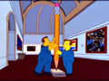 When Homer comments that Groening shouldnt be in a museum, he his hit in the head with a giant pencil eraser, exclaiming that he's being erased. It turns out that two janitors are installing a Claes Oldenberg sculture of a pencil. Oldenberg is known for sculpting boring items like pencils.