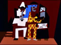 When Homer has run out of inspiration on how to focus his art, Marge takes him to the Springfield Museum where he has a dream of various artworks attacking him, Picasso's Three Musicians appear where their instruments turn into machine guns and shoot at Homer. One of them comments "Hasta la Vista, baby" the bullets leave rectacular holes in Homer, following through with the Cubism style in the painting.